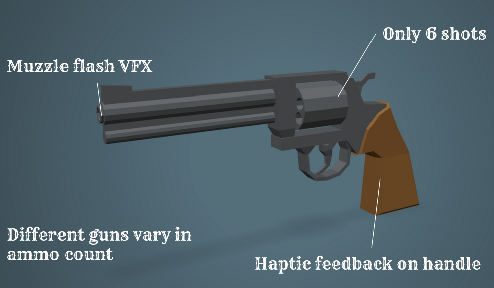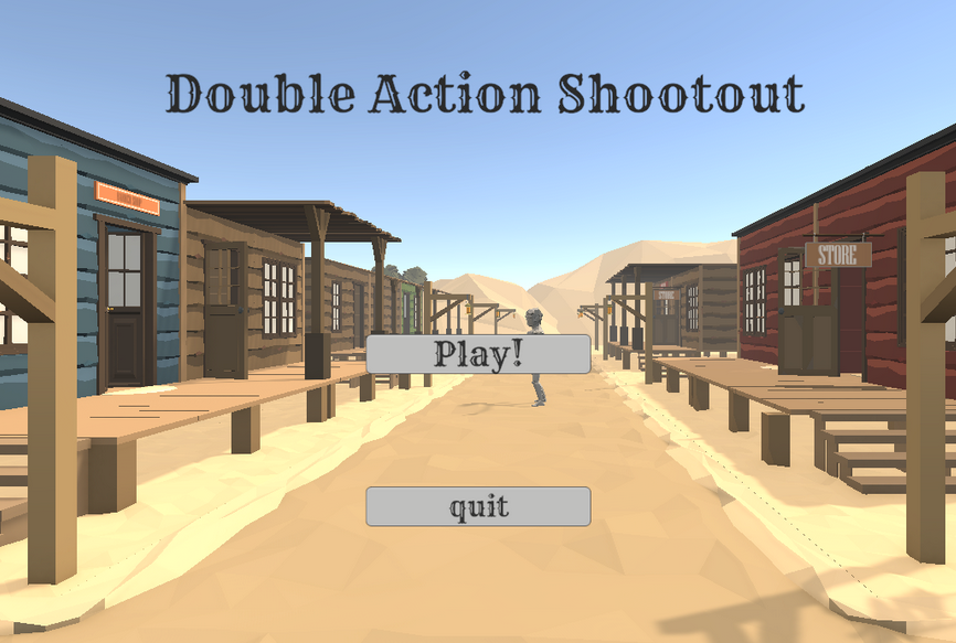 Double Action Shootout is a single-player VR experience set in wild-west town of Dead-Eye Gulch. In it, you seek fortune and glory through the art of the duel. A number of bandits and cutthroats inhabit Dead-Eye Gulch, and its citizens would be happy to pay you to clear them out. If you want to win, you'll need the speed of a cougar, the eyes of a hawk, and the luck of the Devil. Do you have what it takes?